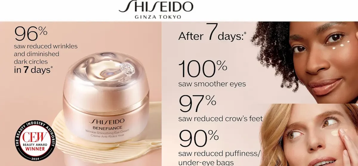 “Revive and smooth your eye area with Shiseido Benefiance Eye Cream, the award-winning anti-aging treatment for wrinkles, dark circles, puffiness, and crow’s feet, designed for all skin types.”